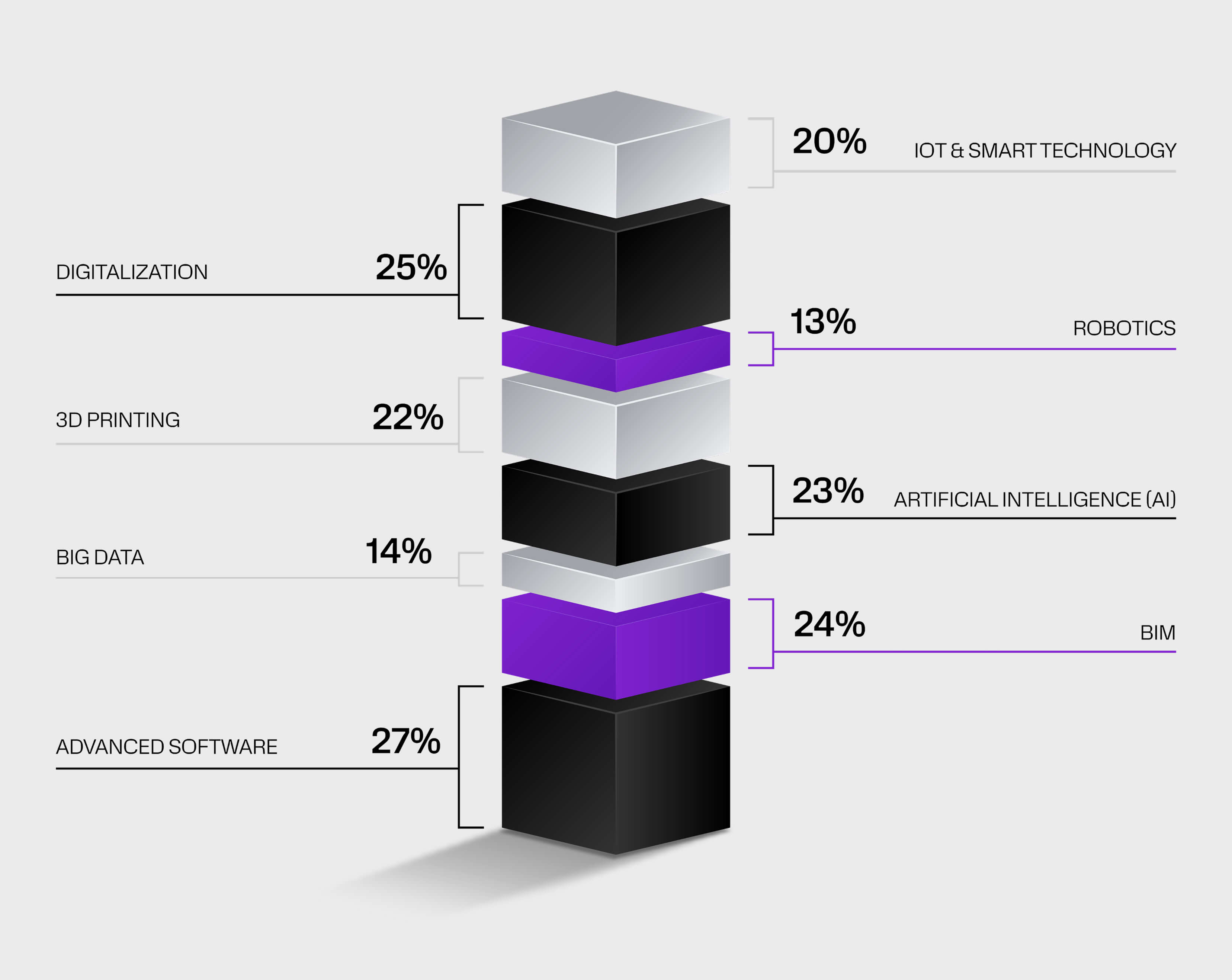 The six trends outlined here are not emerging concepts — they are active forces reshaping construction sites today. Advanced software leads adoption at 27%, followed by BIM at 24%, AI at 23%, and IoT at 20%.
